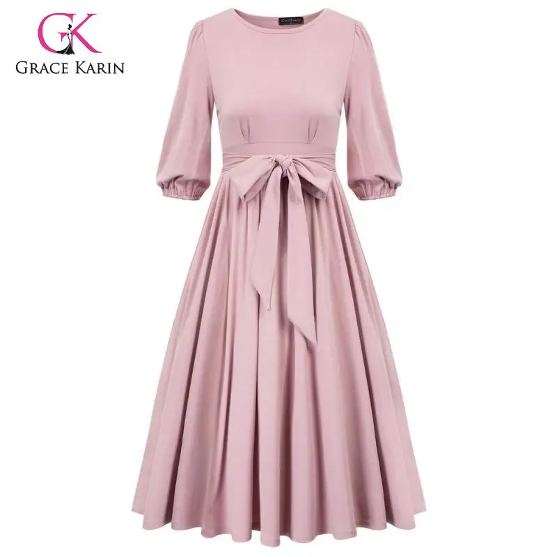 Grace Karin Vintage Dress Solid Pleated A-Line Swing Dress 2020 Autumn New Flared Party Dress Mid-C