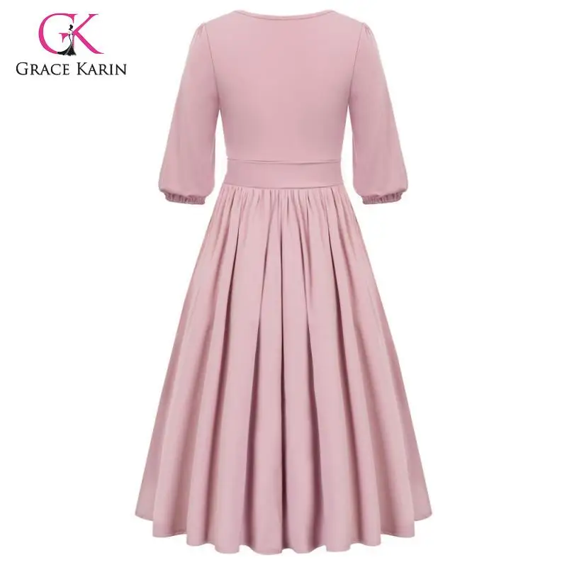 Review Grace Karin Vintage Dress Solid Pleated A-Line Swing Dress 2020 Autumn New Flared Party Dress Mid-C