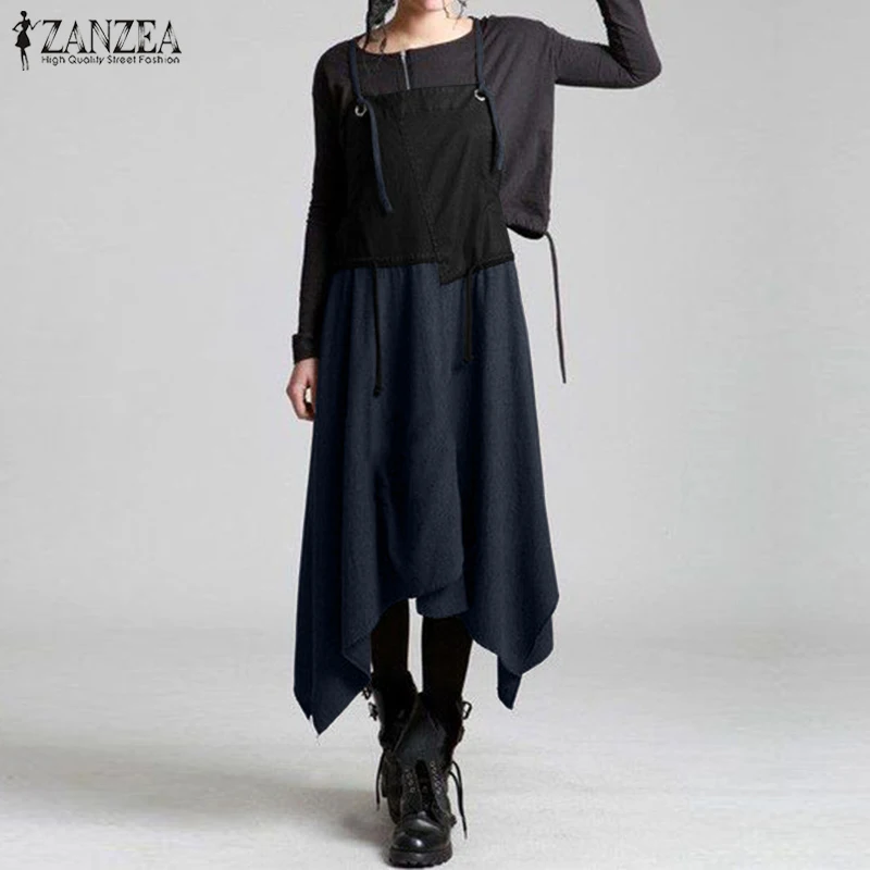 Summer Overalls Dress ZANZEA Women Vintage Strappy Patchwork Denim Dress Asymmetrical Hem Sundress